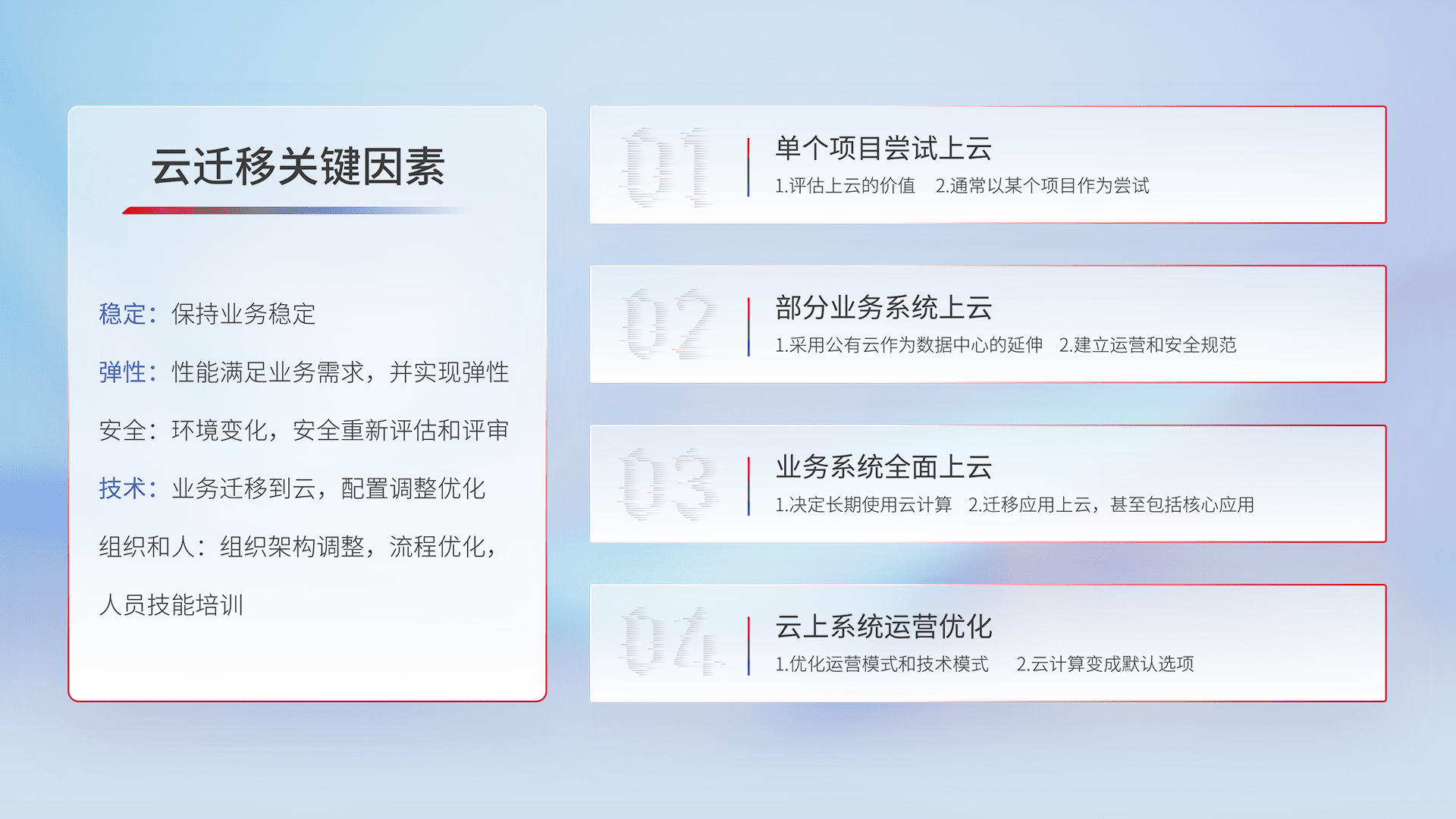 结合实际业务,,,从规划设计、、云平台选型、、、、云原生改造、、、、数据迁移、、、、集成交付,,迁移全过程为客户识别最佳上云路径,,,做好风险识别管理,,设计网络架构、、、、身份权限、、安全审计合规、、、操作审计、、、日志审计、、、、监控告警策略、、多站点容灾设计等,,对云上基础设施进行整体规划,,提升IT治理水平,,,以满足弹性、、高可用、、高性能的需求。。。