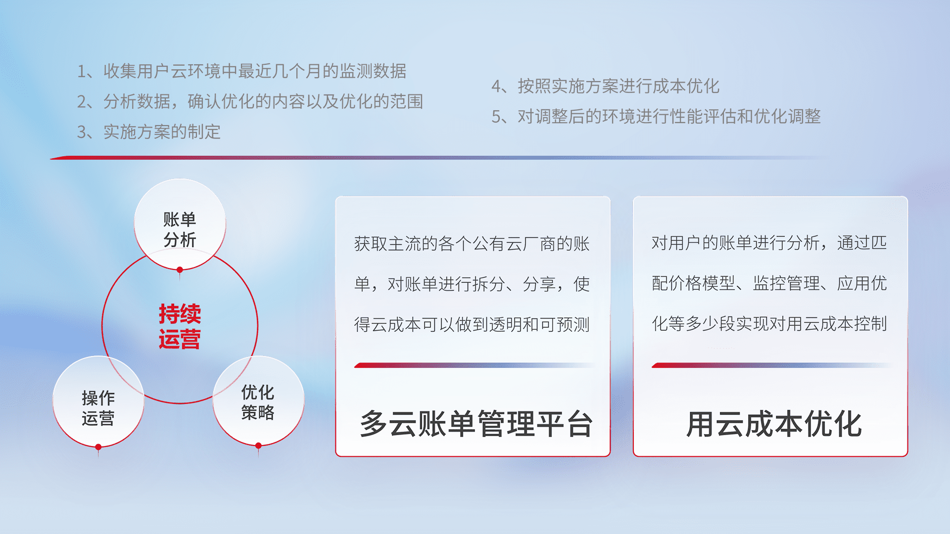 通过多云纳管,,,,以统一的资源数据模型把客户的云资源进行抽象和封装,,进而实现对多云资源的统一操作,,保障云资源管理的可靠性、、稳定性与可用性。。量身定制化运维内容,,,配置、、、开发运维、、补丁管理、、、备份、、、监控、、、、认证和访问管理、、、审计和日常巡检等,,,保障在用云过程中的可靠度,,稳定度以及高可用率。。
